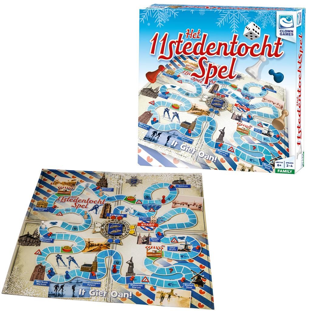 Hét 11-Stedentochtspel. Wie is als eerste bij de finish en wint het felbegeerde Elfstedenkruisje? Gooi met de dobbelsteen en verplaats de pion met het aantal ogen dat is gegooid. Wanneer u op één van de vakjes komt met een plaatje, voer dan de opdracht uit die bij het plaatje hoort. Als u bijvoorbeeld moet klúnen, slaat u een beurt over. Of hebt u de wind in de rug en telt uw worp dubbel? De speler die als eerste over de finish komt, wint de Elfstedentocht. Naast dit fantastische spel bevat dit Hollandsche pakket lekkere producten die heerlijk zullen smaken tijdens het spel.
