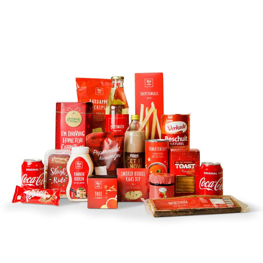 Dit mooi vormgegeven kerstpakket, is gevuld met fijne artikelen voor tijdens de feestdagen. Met het prachtige rode thema, is het voor uw medewerker een feestje om uit te pakken.