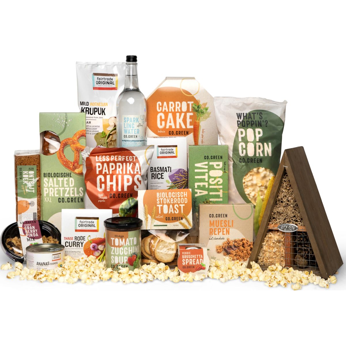 Go Green staat voor lekker en gezond genieten. Vegan is hot en veel producten uit dit pakket zijn dus ook veggie. Go.green zit hem ook in maatschappelijk verantwoord ondernemen, want met dit pakket steunt u de stichting Trees for all. Trees for all plant bomen in Nederland en het buitenland en compenseert daarmee CO2-uitstoot. Van de totale opbrengst gaan ze bomen aankomen en aanplanten. Het leuke driehoekige insectenhotel geschikt voor onder andere bijen en lieveheersbeestjes. Super leuk en heel leerzaam.