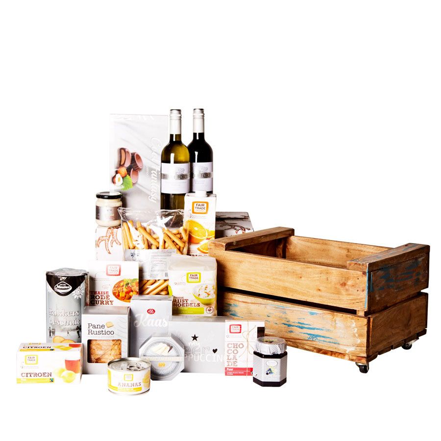 Een prachtig product. Deze opbergkist op wieltjes is gemaakt van 100% sloopmateriaal met een sfeervolle uitstraling en multifunctioneel inzetbaar. Wat dacht u van de volgende toepassingen: lectuurbak, speelgoed voor de kinderen, baddoeken en badartikelen in de badkamer, plantenbak of houtblokken in de tuin. En eenvoudig verrijdbaar. Wij hebben het kerstpakket niet alleen gevuld met deze kist maar ook met verantwoorde producten van Fair Trade.