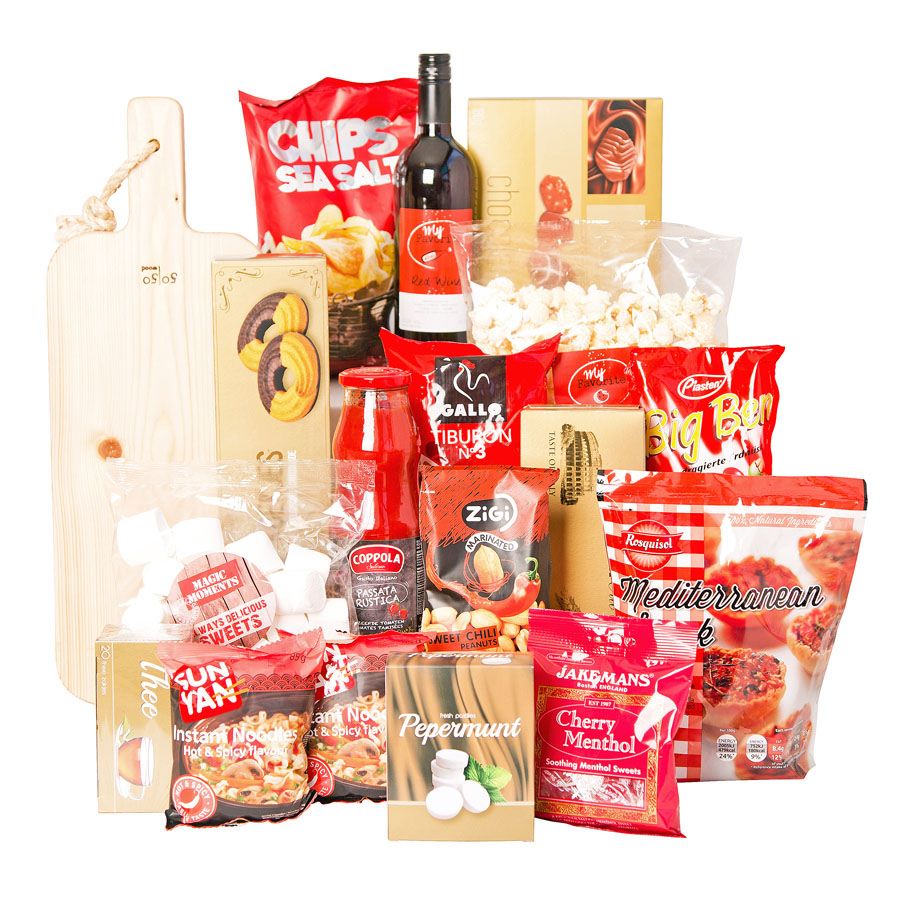 Geniet van een lekker glas rode wijn, geserveerd met bijpassende hapjes op een mooie vurenhouten serveerplank. Verder zitten er nog veel knabbeltjes in zoals popcorn, Mediteraanse toastjes, gekleurde pindas en bonbons.