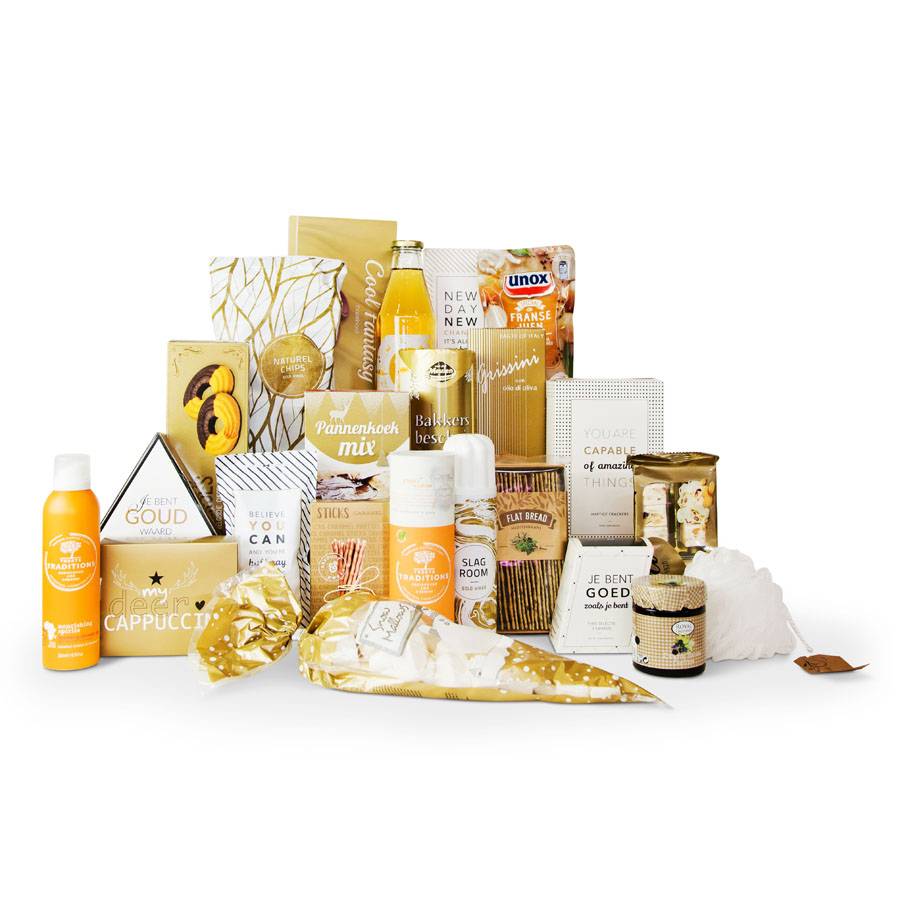 Dit prachtige, goud gevulde kerstpakket zit boordevol heerlijke artikelen, waarvan de verpakkingen voorzien zijn van motiverende quotes. Super leuk om uw medewerker te bedanken voor zijn/haar inzet van het afgelopen jaar.