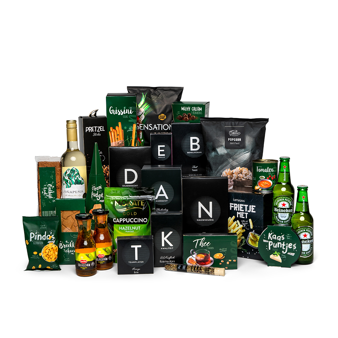 De feestdagen zijn hét moment om uw medewerkers te bedankten en ze het beste te wensen voor het nieuwe jaar. Dat kan natuurlijk op verschillende manieren, maar hoe leuk is het als uw dit kunt doen met het kerstpakket zelf. Dit bomvolle pakket zegt alles. Bedankt!
