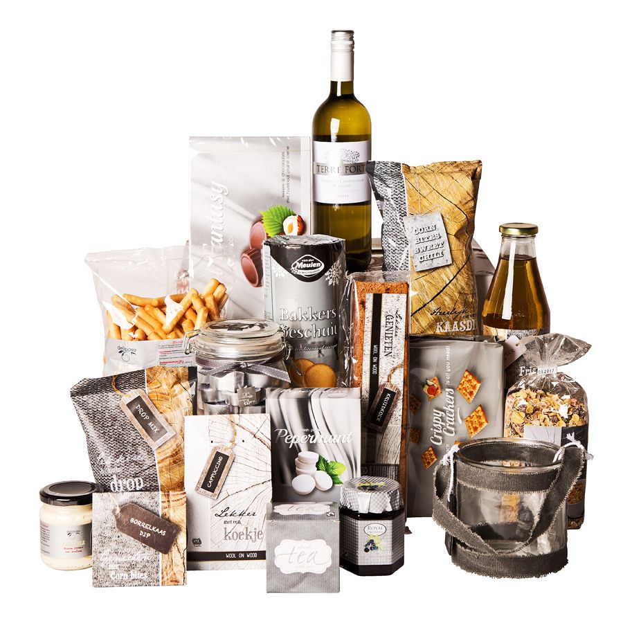We hebben de heerlijkste producten voor u geselecteerd en hebben dit pakket er tot de rand toe mee gevuld. Dat wordt met zn allen de hele dag door smikkelen en smullen. En met het fraaie windlicht creëert u extra sfeer tijdens de feestdagen!