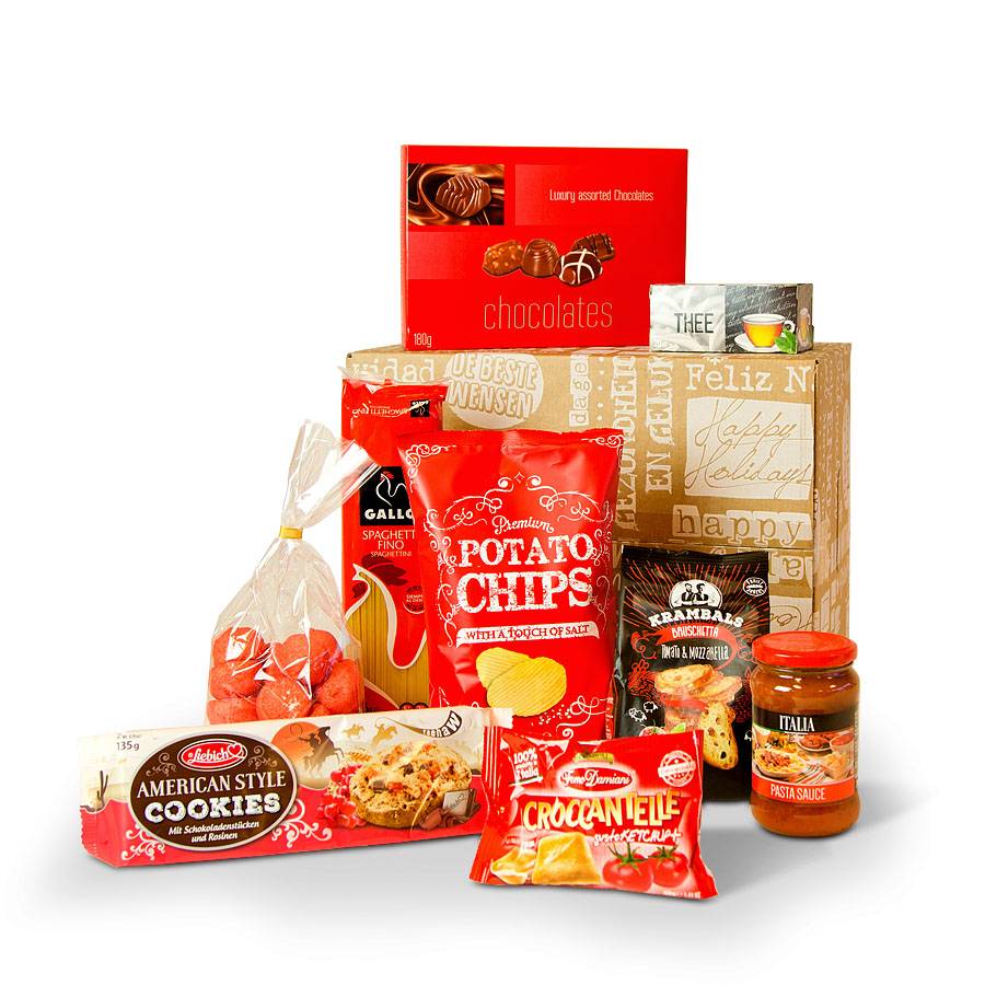 Met dit feestelijke en sfeervolle kerstpakket kunt u echt uitpakken en uw waardering laten blijken aan uw medewerkers. Door de kleur rood wordt u meegenomen naar een fijne kerstsfeer.