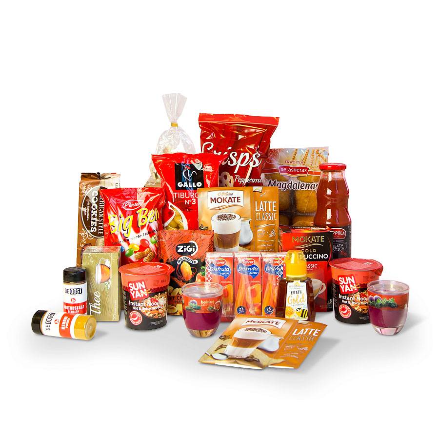 Wat een diversiteit aan producten komt tevoorschijn uit dit bomvolle pakket. De hele dag door met voor ieder wat wils. De chique kleurstelling geeft een bijzondere uitstraling aan dit pakket.
