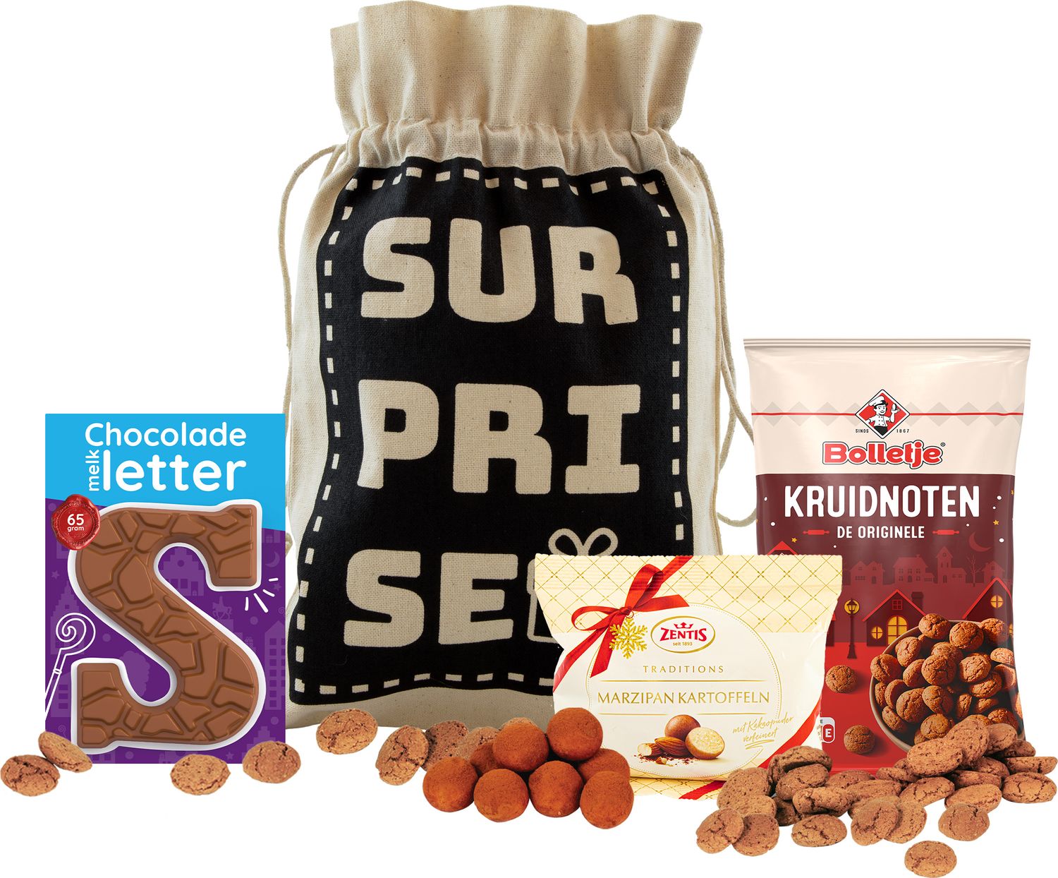 - Origineel bedrukt katoenen zakje (20 x 30 cm) gevuld met: